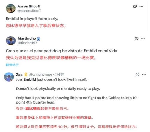 面对恩比德这一系列的糟糕表现,美国球迷纷纷调侃与吐槽,恩比德不再是自己,更是有球迷调侃恩比德提前进入到了季后赛模式,嘲讽恩比德往往会在季后赛期间表现下滑。