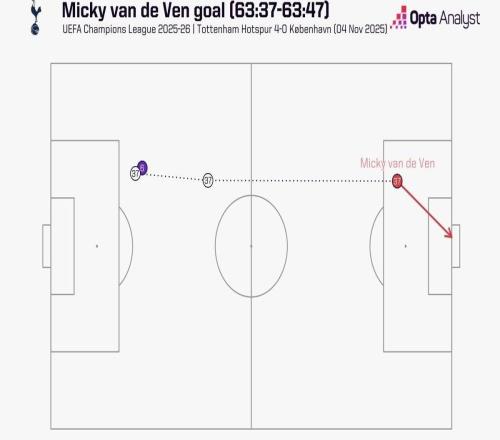 范德芬带球奔袭67.7米破门,为有统计以来欧冠最长 -